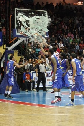 A foto é de uma enterrada de Babby na partida contra o Mavort. A estrutura precária que atende ao basquete equatoriano não aguentou a força rubro-negra.